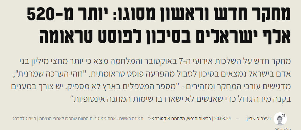 מתחילת המלחמה יש עלייה ב60% במקרי הפוסט טראומה המאובחנים, ומעריכים כי 520 אלף ישראלים בסיכון לפתח אותה בעקבות המלחמה. מדובר בהפרעה שפוגעת בכל תחומי החיים ובעתידו של כל אדם וסביבתו.